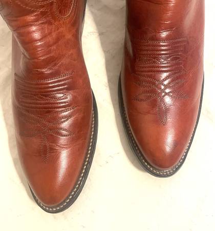 This is pair of Justin Western Boots. They are brown on brown in color, with contrasting stitching on the uppers. They are handmade, and Made in USA. They are in very good to excellent condition, save for a spot on the left toe. Be sure to see the pictures. (1925)