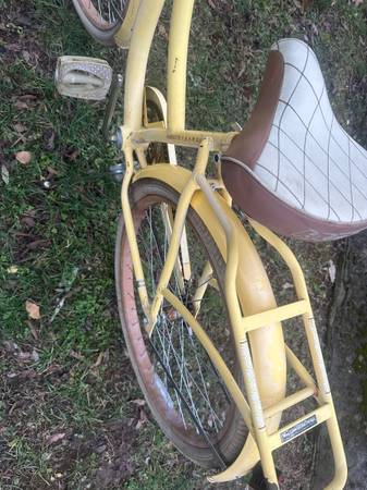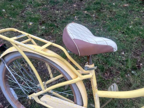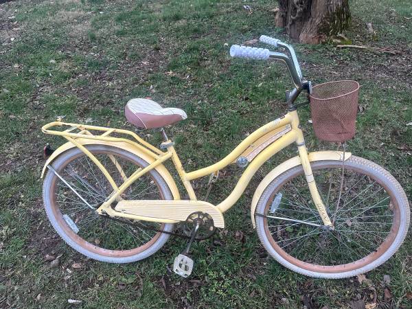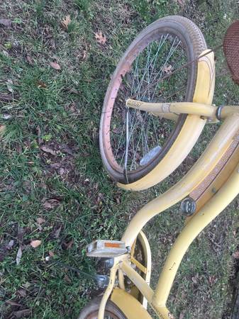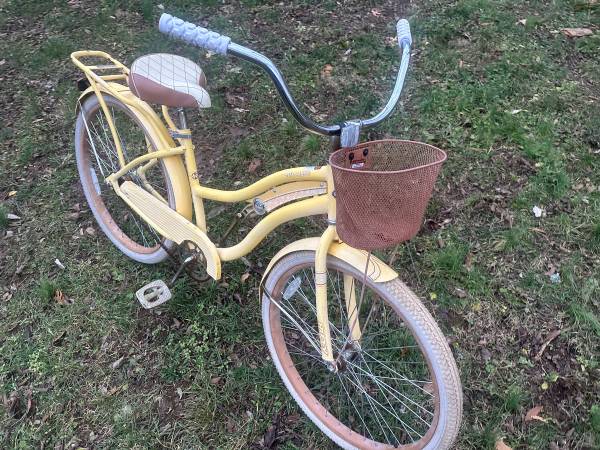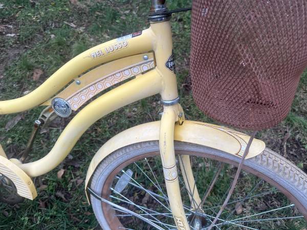 Huffy Nel Lasso single speed cruiser bike yellow Single speed bike Front basket Big comfort seat. Spots of rust and signs of age. Rides well,