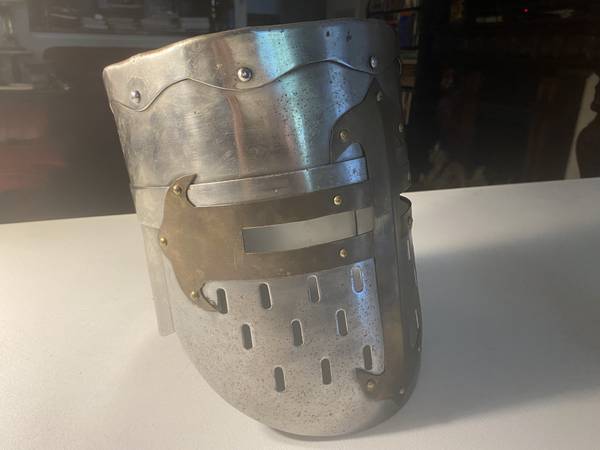 This Crusader knight's helmet and 2-horse set is from my personal collection. You will not find another. Originally, they did not belong together. Yet for some reason, they belong to each other, in a set! You could not find a better match, as the brass on the helmet and the brass on the horses are almost an EXACT match! This set is for keeps. I am only selling it because I am trying to downsize (check out my other listings). These are all heavy pieces - both the helmet and the horses. The set is for a serious collector, which I'm sure you are if you're looking at this. smiley