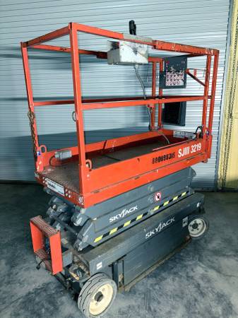 Skyjack SJIII 3219. Good lift overall, no problems. Good batteries hold long charge, good hydraulics no leaks, good tires good tread. Has saved me a ton of ladder work and I don't need it anymore. It's about 32" wide and 70" long. Weighs just over 2,500 pounds. Can work to around 25 foot height. Has 3 foot extending platform. Removable controls to operate without being on lift.