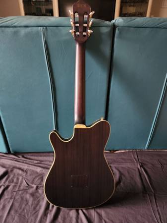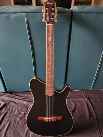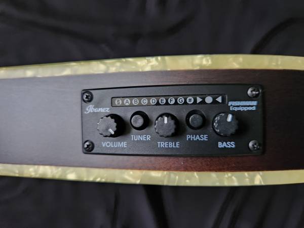 Ibanez AEQ210TF preamp and Fishman Sonicore pickup provide a rich, snappy nylon-string tone when plugged in